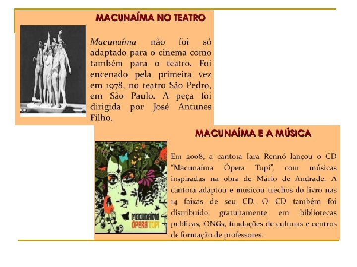 A paisagem nacional em Macunaíma Uma das características que mais chamam a atenção em Macunaíma refere-se à presença de paisagens e traços culturais tipicamente brasileiros. As referências geográficas, a linguagem e as lendas e mitos são algumas das coisas que trazem para o livro traços da cultura do nosso país. Vejamos o seguinte trecho do capítulo “A Francesa e o Gigante”: “O herói teve medo e desembestou numa chispada mãe parque a dentro. O cachorro correu atrás. Correram correram. Passaram lá rente à Ponta do Calabouço, tomaram rumo de Guajará Mirim e voltaram pra leste. Em Itamaracá Macunaíma passou um pouco folgado e teve tempo de comer uma dúzia de manga-jasmim que nasceu do corpo de dona Sancha, dizem. ”