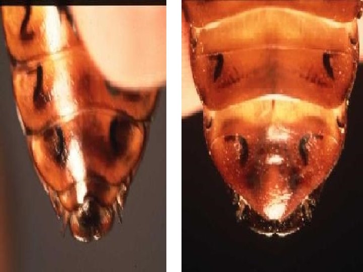 • The second way is to look at the feelers or antennae. The antennae are long, whiplike structures found on the head. Adult males have antennae with many laterallyprojecting sensory hairs. These hairs give their antennae a fuzzy look, especially near the base. The antennae of the female lack these hairs. • The third way of determining sex is to look at the tip of the abdomen, or third section of the body. At the tip of the abdomen there is a ventral plate. In the male this plate is much narrower than in the female.