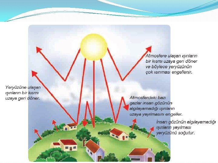 Karbon dioksit ve metan gibi bazı kirletici gazlar, yeryüzünden yansıyarak uzaya yönelen güneş ışınlarını soğurup ısıya dönüştürür. Bunun sonucunda atmosfer daha fazla ısınır. Buna sera etkisi denir.