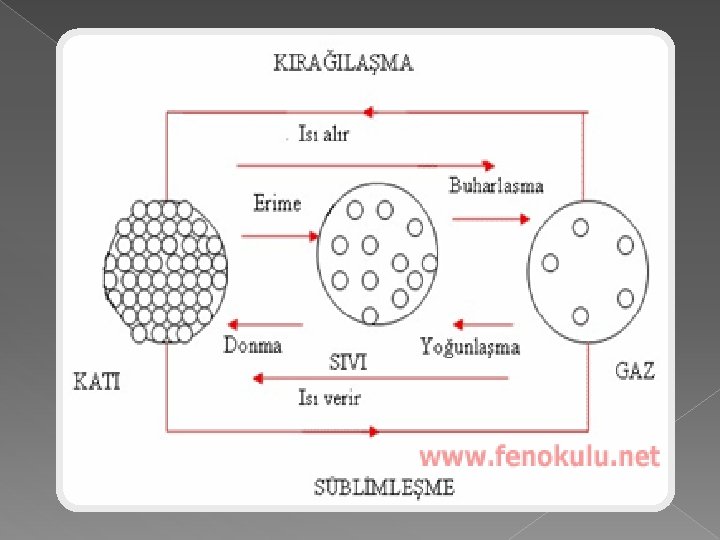 � Su buharı dışarı ısı enerjisi verip soğurken moleküllerin hareket enerjisi azalır ve aralarındaki çekim kuvveti artar. Belli bir sıcaklığa gelince buhar yoğuşur ve suya dönüşür. Artık moleküller birbirleri ile temas halindedir ve birbiri üzerinde kayma hareketi yapabilirler. Soğuma ile dışarı ısı verme işlemi devam ettikçe su molekülleri arasında çekim kuvveti daha da artar. Mesafe iyice kapanır ve moleküller sıkı dizili hale geçerek buza dönüşür. GAZ YOĞUŞMA SIVI DONMA KATI