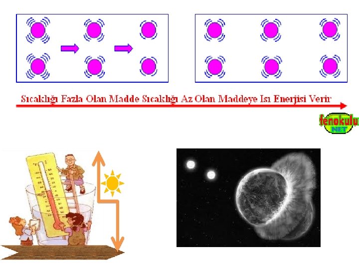 a) Isıtılan Maddenin Taneciklerinin Hareketi : Maddeler ısıtıldığında yani ısı enerjisi aldığında maddeyi oluşturan taneciklerin hareket enerjileri artar yani tanecikler daha hızlı hareket ederler. Hızlı hareket eden tanecikler yavaş hareket eden taneciklere çarparak enerjilerini yavaş hareket eden taneciklere aktarır. Böylece maddeyi oluşturan taneciklerin hızları birbirine eşit olur. Taneciklerin hızları birbirine eşit olduğu için maddenin sıcaklığı her yerinde aynı olur ve maddenin sıcaklığı ilk duruma göre artar. Sıcak ortamda bulunan tanecikler hızlı hareket ettikleri için tanecikler arasındaki boşluk fazladır ve fazla hacim kaplarlar. •