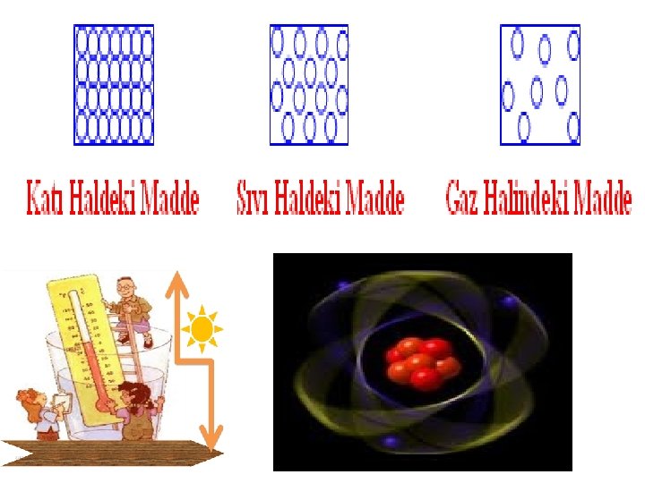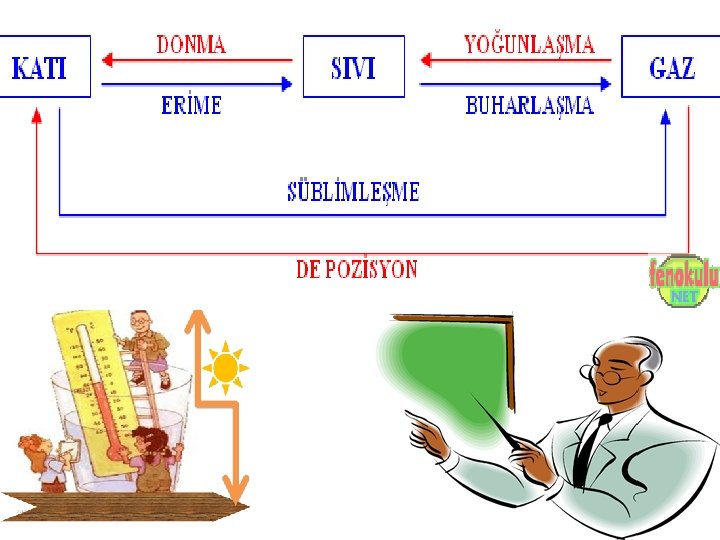 ******a) Sıcaklık Değişimi : Sıcaklığın var olmasının nedeni ısı enerjisidir. Sıcaklık, maddenin aldığı veya verdiği ısı enerjisinin bir göstergesidir. Bir madde dışarıdan ısı enerjisi aldığında yani madde ısıtıldığında, verilen ısı enerjisini maddeyi oluşturan tanecikler alır ve tanecikler bu enerjiyi hareket enerjisine dönüştürür. Yani maddeyi oluşturan taneciklerin hareket enerjileri artar. Bu nedenle de maddenin sıcaklığı artar. Bir madde dışarıya ısı enerjisi verdiğinde yani madde soğutulduğunda maddeyi oluşturan taneciklerin hareket enerjileri azalır. Bu nedenle de maddenin sıcaklığı azalır.