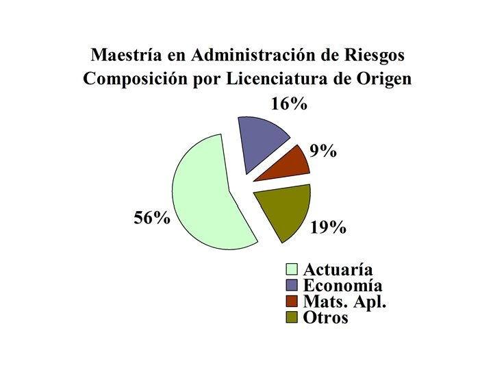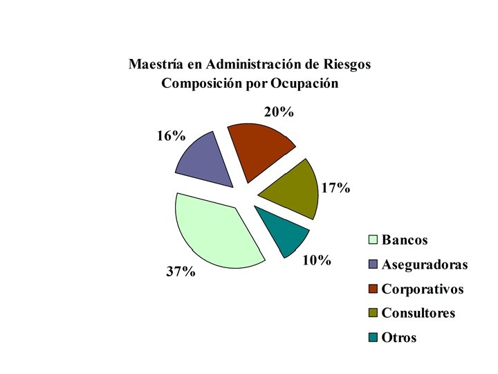 Características de nuestros egresados • Toma de decisiones, respaldadas por – Conocimiento cabal de los modelos utilizados – Manejo de las técnicas adecuadas – Plasmada en estrategias bien estructuradas • Nuestros alumnos aprenden la diferencia entre cumplir con requisitos formales y establecer una verdadera cultura de administración de riesgos.