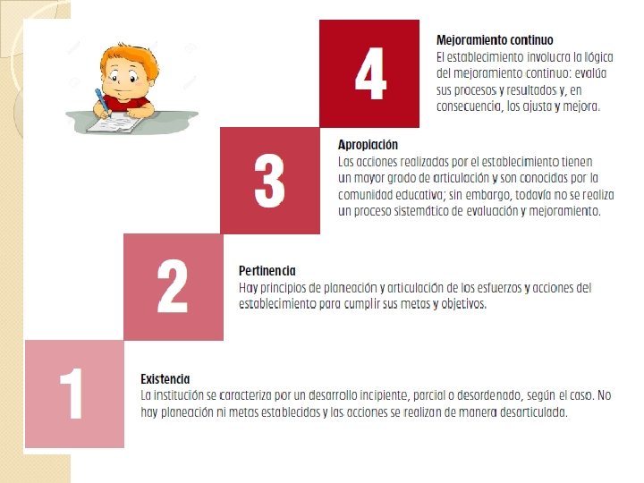 ETAPAS DEL PMI ETAPA Primera etapa "Autoevaluación Institucional" Segunda etapa "Plan de Mejoramiento" PASOS 1. Revisión de la identidad institucional 2. Evaluación de cada una de las areas de gestión teniendo en cuenta los criterios de inclusión 3. Elaboración del perfil Institucional 4. Establecimiento de las fortalezas y oportunidades de mejoramiento 1. Formulación de los objetivos teniendo en cuenta criterios de inclusión 2. Formulación de las metas que parten de la equidad como principio 3. Definición de los indicadores de resultados 4. Definición de Actividades y Responsables 5. Elaboración del cronograma de actividades 6. Definición de los recursos necesarios para la ejecución del Plan de Mejoramiento 7. Divulgación del plan de mejoramiento a la comunidad educativa