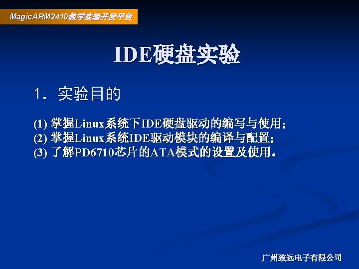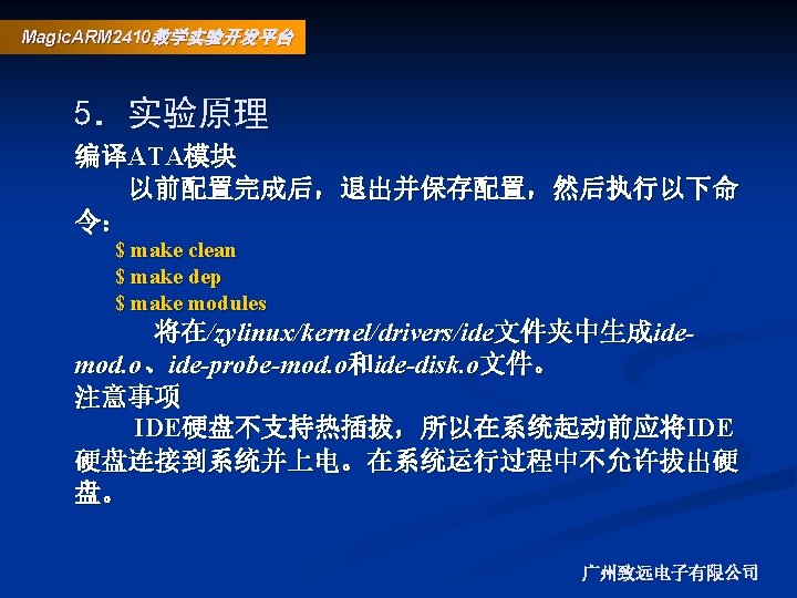 Magic. ARM 2410教学实验开发平台 6.实验步骤 (5)执行以下命令加载ATA模块: # cd /tmp # insmod ide-mod. o # insmod ide-probe-mod. o # insmod ide-disk. o 这时执行lsmod命令将看到以下已加载模块: # lsmod Module Size Used by ide-disk 8128 0 ide-probe-mod 7888 0 ide-mod 41392 0 [ide-disk ide-probe-mod] 广州致远电子有限公司