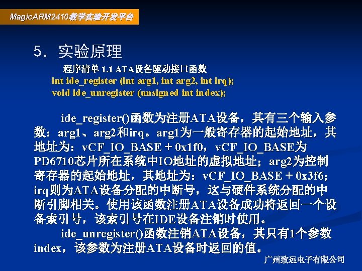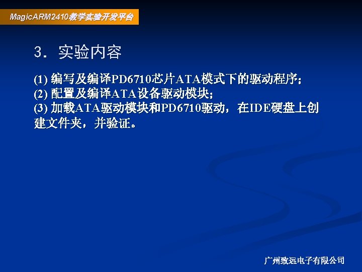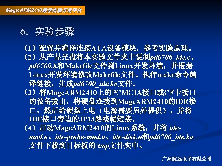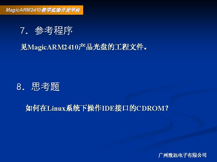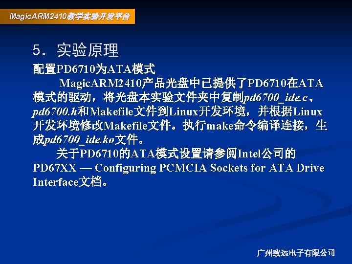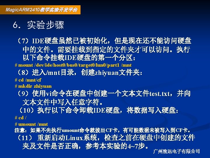 Magic. ARM 2410教学实验开发平台 6.实验步骤 (6)执行以下命令,加载PD 6710的ATA驱动模块: # insmod pd 6700_ide. ko 执行以上命令后终端将会打印出许多配置信息, 最后将出现以下信息: hda: QUANTUM FIREBALLlct 08 04, ATA DISK drive ide 0 at 0 xd 20001 f 0 -0 xd 20001 f 7, 0 xd 20003 f 6 on irq 36 hda: 8421840 sectors (4312 MB) w/418 Ki. B Cache, CHS=8912/15/63 Partition check: /dev/ide/host 0/bus 0/target 0/lun 0: p 1 p 2 < p 5 p 6 p 7 > PD 6710 IDE: ide_register() at 0 xd 20001 f 0 & 0 xd 20003 f 6, irq 36 广州致远电子有限公司