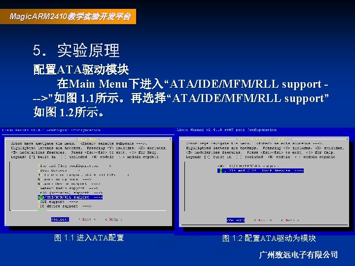 Magic. ARM 2410教学实验开发平台 5.实验原理 进入到“IDE, ATA and ATAPI Block devices --->”配置 选 项 , 设 置 “Enhanced IDE/MFM/ RLL disk/cdrom /tape/floppy support”为模块,并设置“Include IDE/ATA-2 DISK support”和 “Include IDE/ATA-2 DISK support”为 模块,如图 1. 3所示。 图 1. 3 配置ATA选项 广州致远电子有限公司