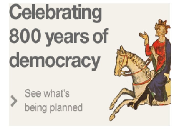 • Magna Carta challenged and tried to restrict the power of King John's government. He had to take into account the wishes of his barons. • Today, voters in democracies can vote, protest and speak out against their governments. A democratic government must take into account the wishes of its voters just like king John was supposed to take into account the wishes of his barons. • Our current rights as British citizens partly date back to Magna Carta.