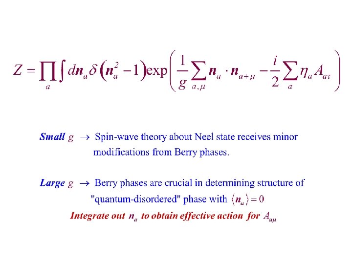 Simplest large g effective action for the Aam This theory can be reliably analyzed by a duality mapping. d=2: The gauge theory is always in a confining phase and confining there is bond order in the ground state. d=3: A deconfined phase with a gapless “photon” is possible. N. Read and S. Sachdev, Phys. Rev. Lett. 62, 1694 (1989). S. Sachdev and R. Jalabert, Mod. Phys. Lett. B 4, 1043 (1990). K. Park and S. Sachdev, Phys. Rev. B 65, 220405 (2002).