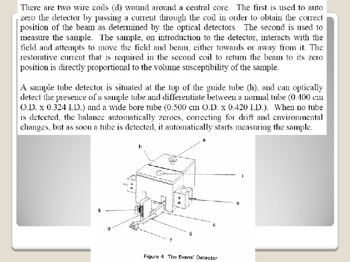 ◦ Why are we doing this experiment? �Magnetic Properties reveal numbers of unpaired electrons �The number of unpaired electrons tell us about oxidation state, geometry, ligand field strength, etc… ◦ How are we doing this experiment? �We are using a Johnson-Matthey MSB-Auto Magnetic Susceptibility Balance �It uses the Evan’s detector which is a modified Gouy Magnetic Susceptibility