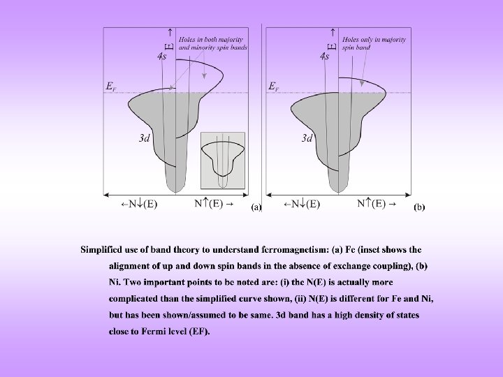 Band Theory to Understand Ferromagnetism As mentioned before a correct theory of magnetism in metals has to involve bands as the electrons are not localized to atoms. However, as noted before, most of the electrons (especially in 3 d metals which are elemental magnets) are rather localized and the 'free' electrons (4 s) do not contribute to the ferromagnetic behaviour. Truly speaking the 3 d electrons in transition metals are neither fully localized nor fully free. Band theory is able to explain the non-integral values of magnetic moment per atom; though, the values may often not match exactly. The density of states varies in a complicated manner. In Fe the 3 d electrons are all not fully localized and about 5 -8% have some itinerant character and these electrons mediate the exchange coupling between the localized moments. Using the observed magnetic moment per atom ( H) of Fe to be 2. 2 B the up-spin and down-spin occupancy can be calculated as: ,