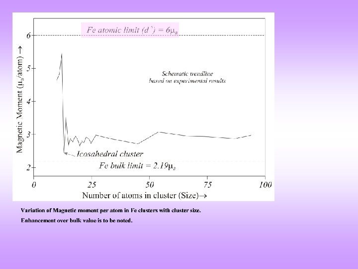 Ferromagnetic clusters q In small clusters (with less than 20 atoms) there are large oscillations in the magnetic moment of the cluster (calculated as magnetic moment per atom). q For more than 600 atoms in the cluster 'bulk-like' behaviour emerges (i. e. with increasing number of atoms the oscillations die down and bulk behaviour emerges). q Fe can have a maximum possible moment of 6 B/atom (3 B orbital + 3 B spin). Fe 12 cluster has a moment of 5. 4 B/atom practically very little of the orbital moment is quenched in the cluster. Fe 13 however has a moment of only 2. 44 B. Ni 13 cluster has an abnormally low moment as well and this is attributed to the icosahedral structure of the cluster (which is densely packed). With larger and larger cluster size the orbital contribution seems to be low; but, there is still an enhancement of the magnetic moment over the bulk value. Thus structure and packing seem to play an important role in the net magnetic moment obtained.