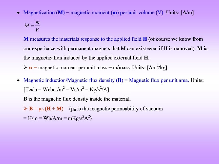 q If a loop of area A is carrying a current I, the intrinsic intensity of the magnetic field is given by the magnetic moment vector (m or ) directed from the north pole to the south pole; such that the magnitude of m is given by: m = IA (units: [Am 2]). q The magnetic moment is the measure of the strength of the magnet and is the ability to produce (and be affected by) a magnetic field. Important quantities in magnetism