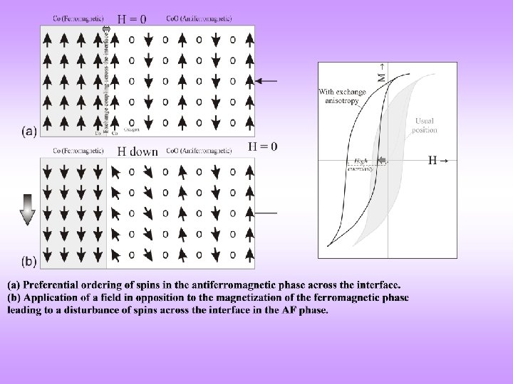 Magnetism of Hybrids: Exchange anisotropy q Due to exchange coupling of spins across an interface between a ferromagnetic phase and an antiferromagnetic phase, there is a preferred direction (anisotropy) for the field, which leads to a shift in the hysteresis (M-H) loop. [E. g. Co particles (ferromagnetic) covered with Co. O (antiferromagnetic with large crystal anisotropy)]. q Steps involved in creating exchange anisotropy: • Have a single domain FM particle (say Co) in contact with a AFM layer (Co. O) • Apply a field above the Néel temperature of the AFM phase to saturate the FM phase • Cool the system below the Néel temperature of the AFM phase to introduce a preferential alignment of spins across the interface (in the AFM phase). The spins in the FM phase will maintain their orientation even after the field is removed. • Construct the usual M-H loop q If the field is removed the spins in the FM phase will flip to the field-cooled orientation, due to the influence of the AFM phase. As the field direction is reversed, the spins across the interface in the AFM (with large crystal anisotropy) oppose the reversal of spins in the FM phase. Hence, the exchange coupling leads to large coercivity value.