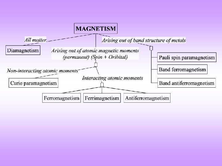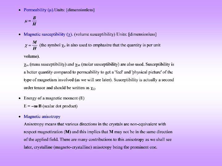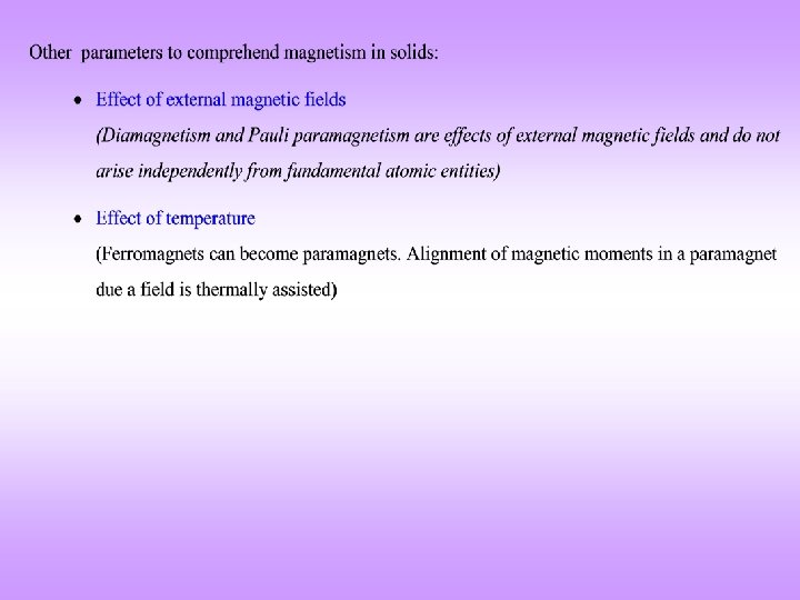 Paramagnetism q There are two distinct types of paramagnetism: (i) that arising when the atom/molecule has a net a magnetic moment, (ii) that come from band structure (Pauli spin or weak spin paramagnetism). q If the net magnetic moments (within the atom/molecule) do not cancel out then the material is paramagnetic. Oxygen for example has a net magnetic moment = 2. 85 B per molecule. A point to be noted here is that even if there are many electrons in the atom; most of the moments cancel out, leaving a resultant of a few Bohr magnetons. In the absence of an external field these magnetic moments point in random directions and the magnetization of the specimen is zero. When a field is applied two factors come into picture: (i) the aligning force of the magnetic field (we have already seen what this alignment means!) (ii) the disordering tendency of temperature. q The combined effect of these two factors is that only partial alignment of the magnetic moments is possible and the susceptibility of paramagnetic materials has a small value. For example Oxygen has a m (20 C) = 1. 36 10 6 m 3/Kg.