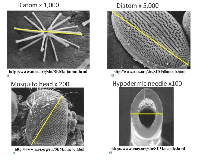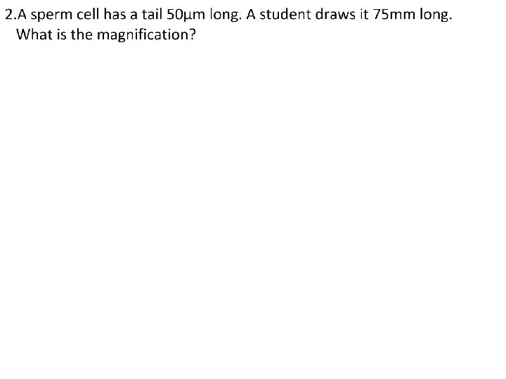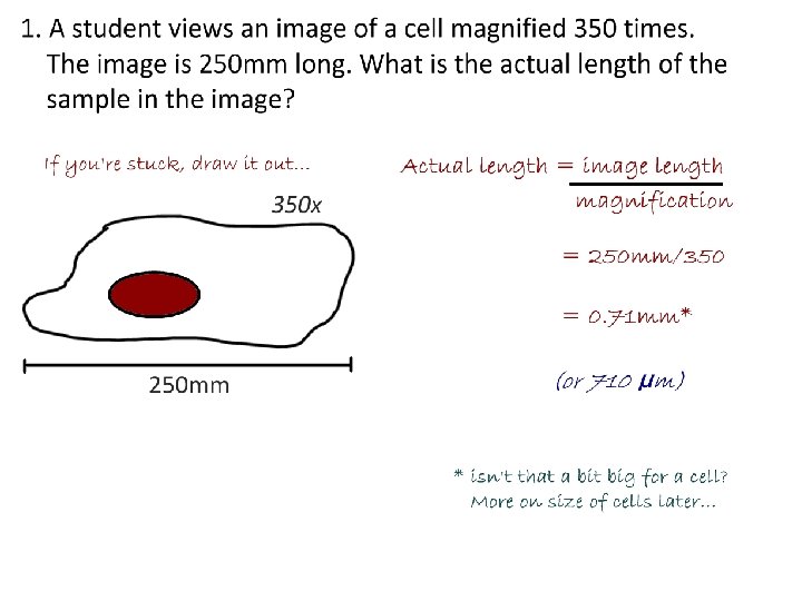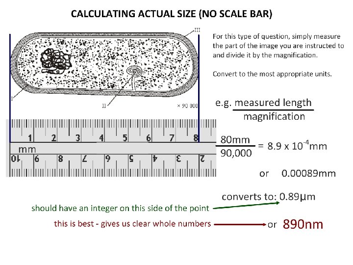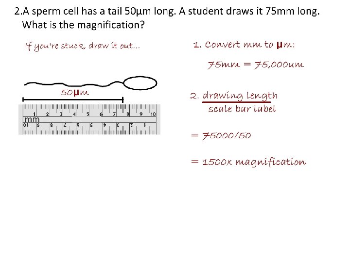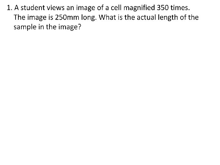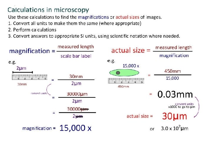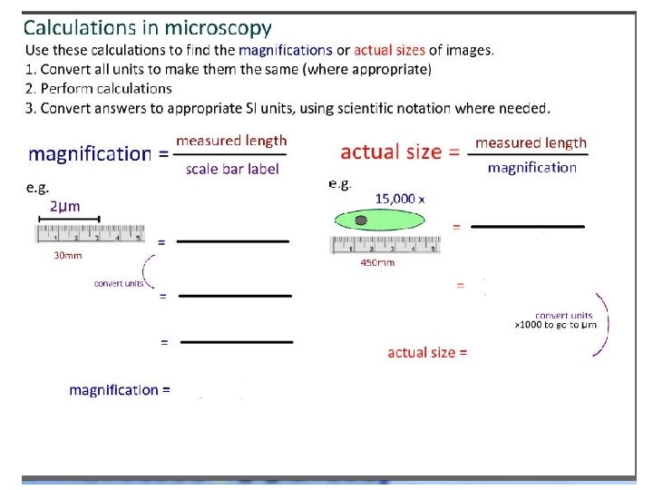 Magnification On an image of a specimen it is useful to show much larger/smaller the image is than the real specimen. This is called magnification. To calculate magnification • using a ruler measure the size of a large clear feature on the image • measure the same length on the specimen • convert to the same units of measurement Magnification = length on the image /length on the specimen Length of the actual specimen = length on the image/Magnification