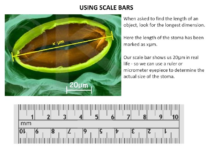 Scale Bars • A scale bar is a line added to a drawing, diagram or photograph to show the actual size of the structures. • The scale bar in the picture allows you quickly to determine the approximate size of a feature. • The main feature in the micrograph is a nucleus with a dark region called the nucleolus. • Using the picture estimate the size of the nucleus and its nucleolus.