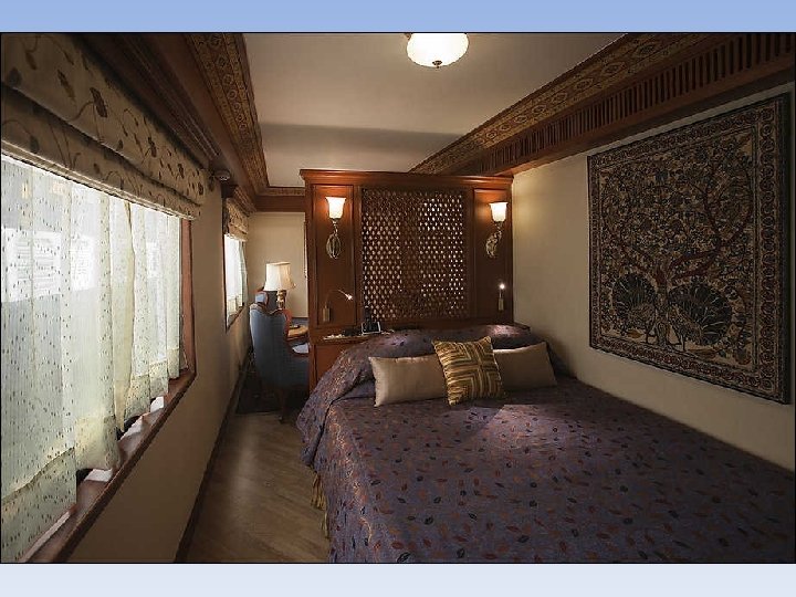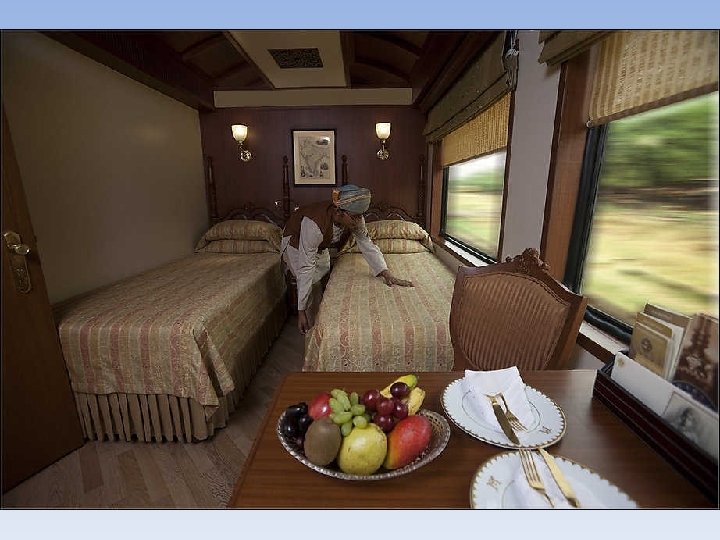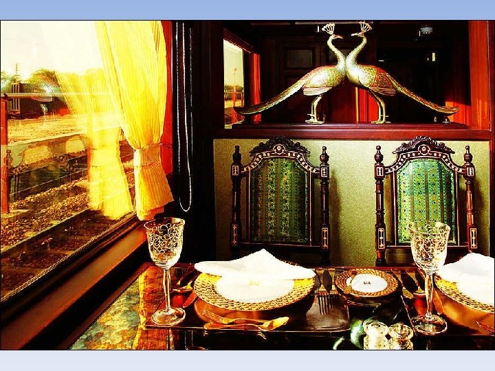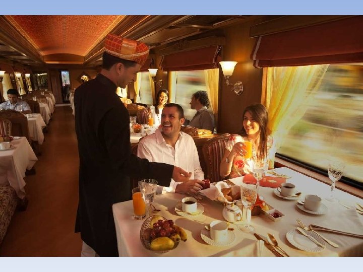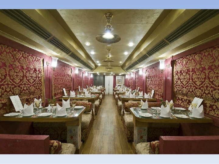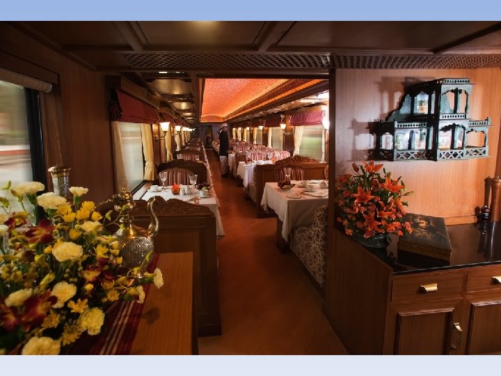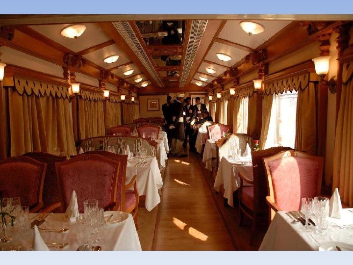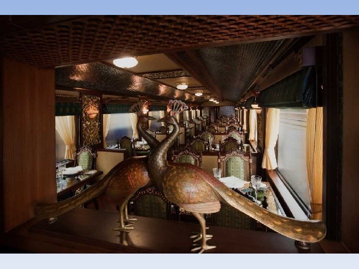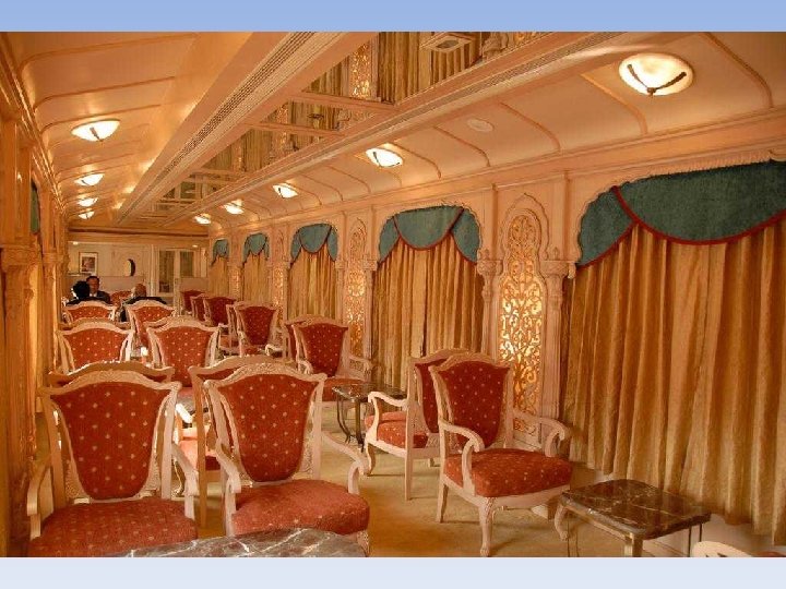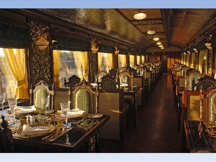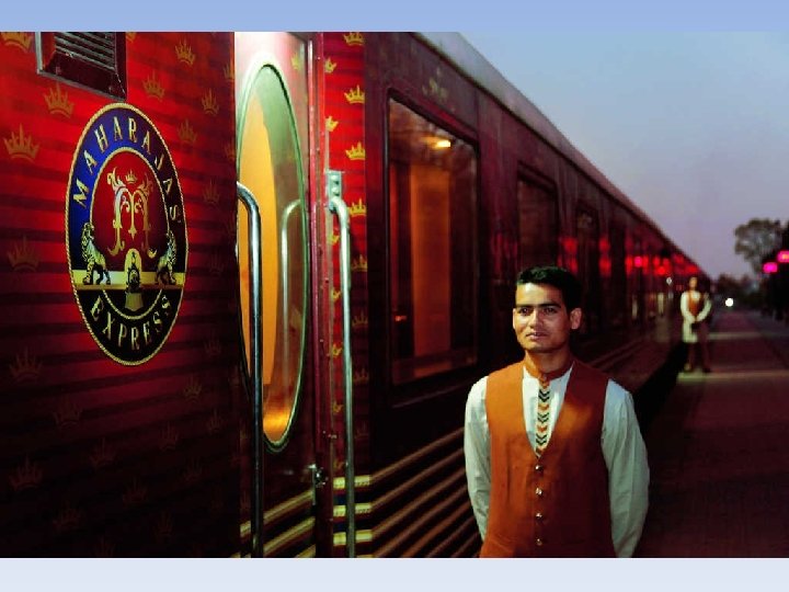 Maharajas 'Express El El Maharajas 'Express está operado por Indian Railway Catering y Corporación de Turismo y es el tren de lujo más caro del mundo. Realiza 5 circuitos que cubren más de 12 destinos en todo el noroeste y centro de la India, centradas principalmente en Rajasthan entre los meses de octubre a abril. El Maharajas 'Express fue votado como el "Líder de tren de lujo del mundo" dos veces, en una fila en Los World Travel Awards, 2012 y 2013. El tren Maharajas 'Express ha sido equipado con instalaciones modernas para ofrecer la máxima comodidad a los invitados, como la suspensión neumática, la televisión en directo, wifi, cuarto de baño adjunto, coches comedor, bar, salón y tienda de souvenirs. Cabinas más grandes tienen bañera de pie y salas de estar amplias. El tren cuenta con 23 vagones que incluyen alojamiento, comedor, bar, sala de estar, el generador y los coches de la tienda. . Alojamiento disponible en 14 vagones de invitados con capacidad total de pasajeros de 88. El tren también tiene un salón llamado el Club de Rajah con un bar privado, dos vagones restaurante y un coche bar dedicado. ] Una tienda de regalos a bordo ofrece objetos de interés para los pasajeros del tren. También está equipado con una planta de filtración de agua.