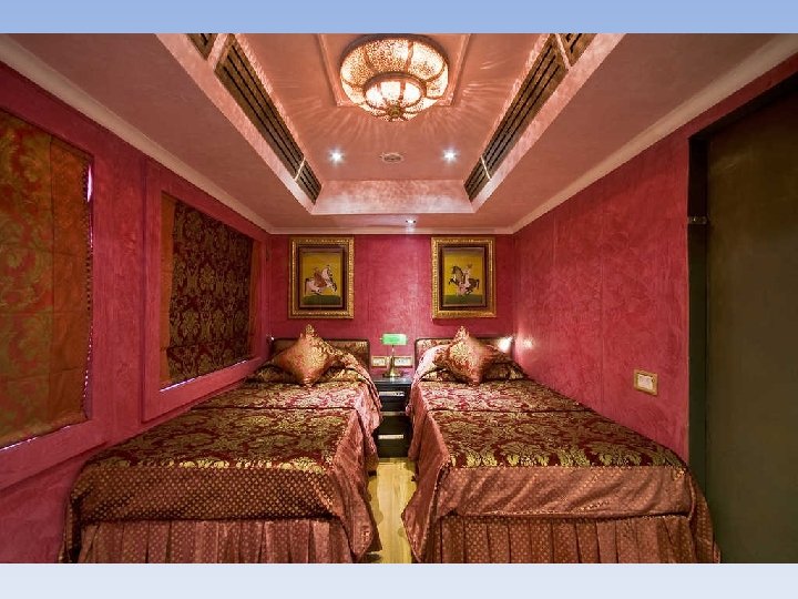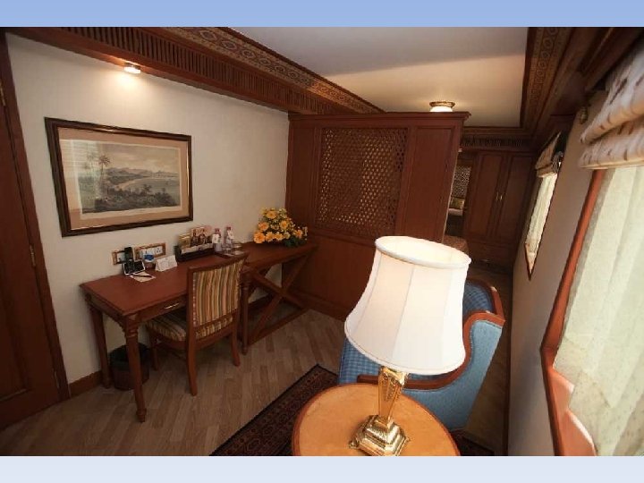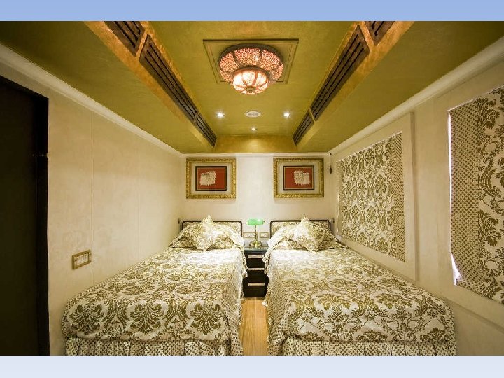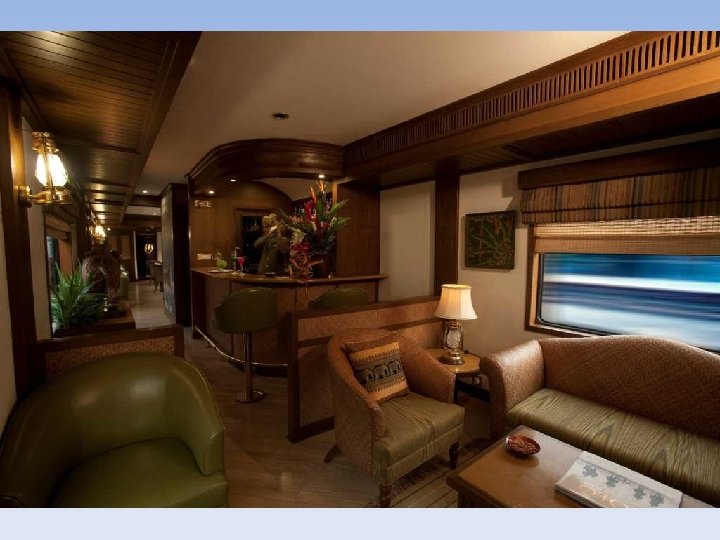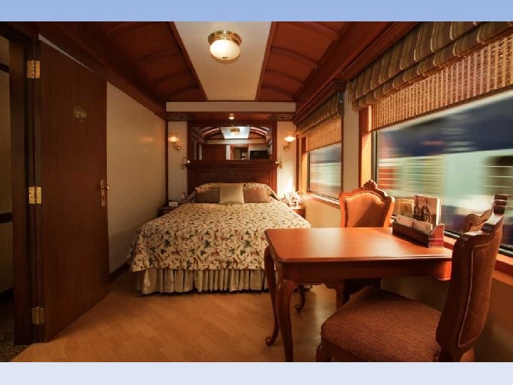 Configuración de las cabinas • 5 Deluxe Cars • 6 Junior Suite Coches • 2 Suite de Coches • Coche 1 Suite Presidencial • 1 coche y 1 Bar Lounge Car • 2 coches restaurante • 1 Cocina Car 1 Personal Coach • 1 Gerentes Ejecutivos y • Gerentes de tours en autobús