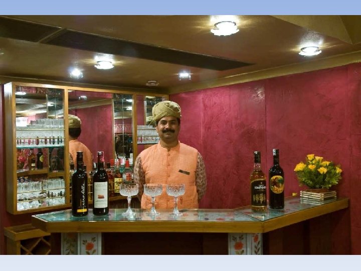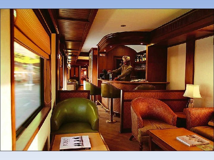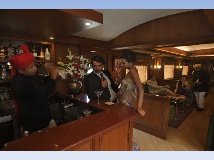 Un carro bar dedicado, el Bar Safari, ofrece vinos, licores y cervezas junto con aperitivos y entrantes y un lounge bar llamado el club Rajah equipado con una biblioteca y multilingües juegos ofrece una experiencia de salón informal.