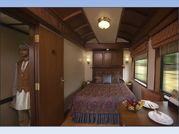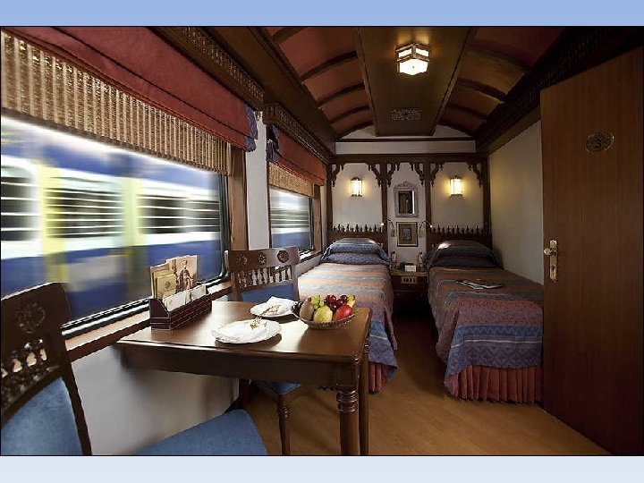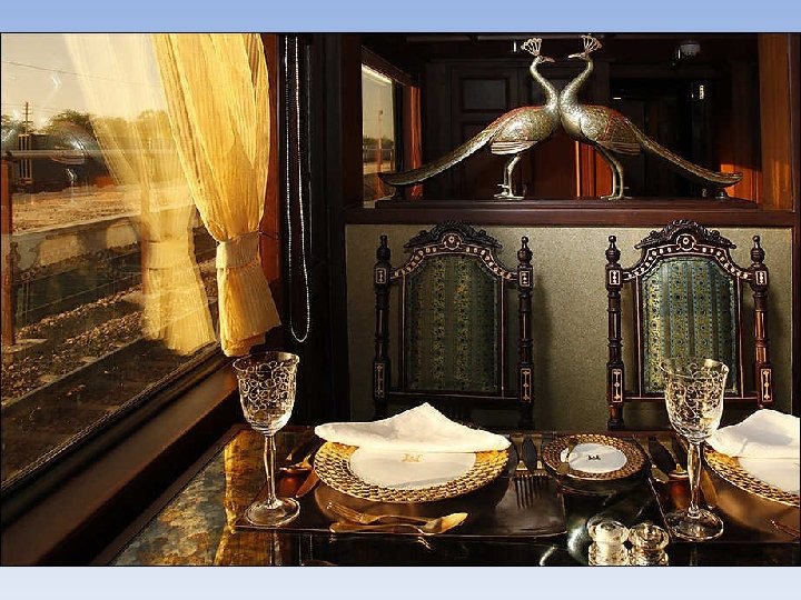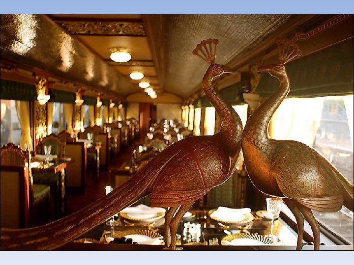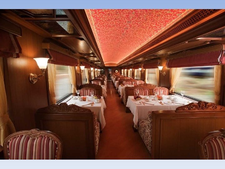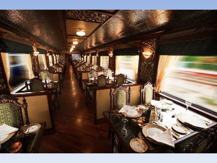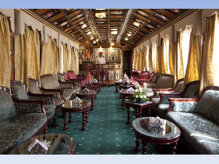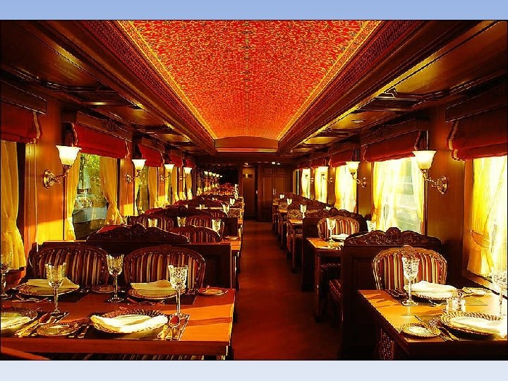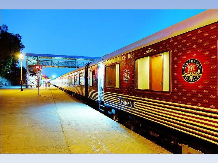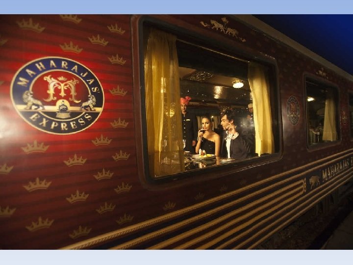 Maharajas 'Express El El Maharajas 'Express está operado por Indian Railway Catering y Corporación de Turismo y es el tren de lujo más caro del mundo. Realiza 5 circuitos que cubren más de 12 destinos en todo el noroeste y centro de la India, centradas principalmente en Rajasthan entre los meses de octubre a abril. El Maharajas 'Express fue votado como el "Líder de tren de lujo del mundo" dos veces, en una fila en Los World Travel Awards, 2012 y 2013. El tren Maharajas 'Express ha sido equipado con instalaciones modernas para ofrecer la máxima comodidad a los invitados, como la suspensión neumática, la televisión en directo, wifi, cuarto de baño adjunto, coches comedor, bar, salón y tienda de souvenirs. Cabinas más grandes tienen bañera de pie y salas de estar amplias. El tren cuenta con 23 vagones que incluyen alojamiento, comedor, bar, sala de estar, el generador y los coches de la tienda. . Alojamiento disponible en 14 vagones de invitados con capacidad total de pasajeros de 88. El tren también tiene un salón llamado el Club de Rajah con un bar privado, dos vagones restaurante y un coche bar dedicado. ] Una tienda de regalos a bordo ofrece objetos de interés para los pasajeros del tren. También está equipado con una planta de filtración de agua.