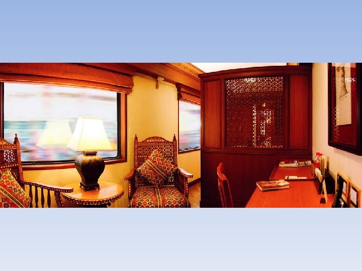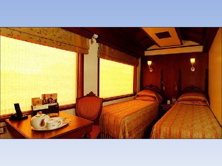 Configuración de las cabinas • 5 Deluxe Cars • 6 Junior Suite Coches • 2 Suite de Coches • Coche 1 Suite Presidencial • 1 coche y 1 Bar Lounge Car • 2 coches restaurante • 1 Cocina Car 1 Personal Coach • 1 Gerentes Ejecutivos y • Gerentes de tours en autobús