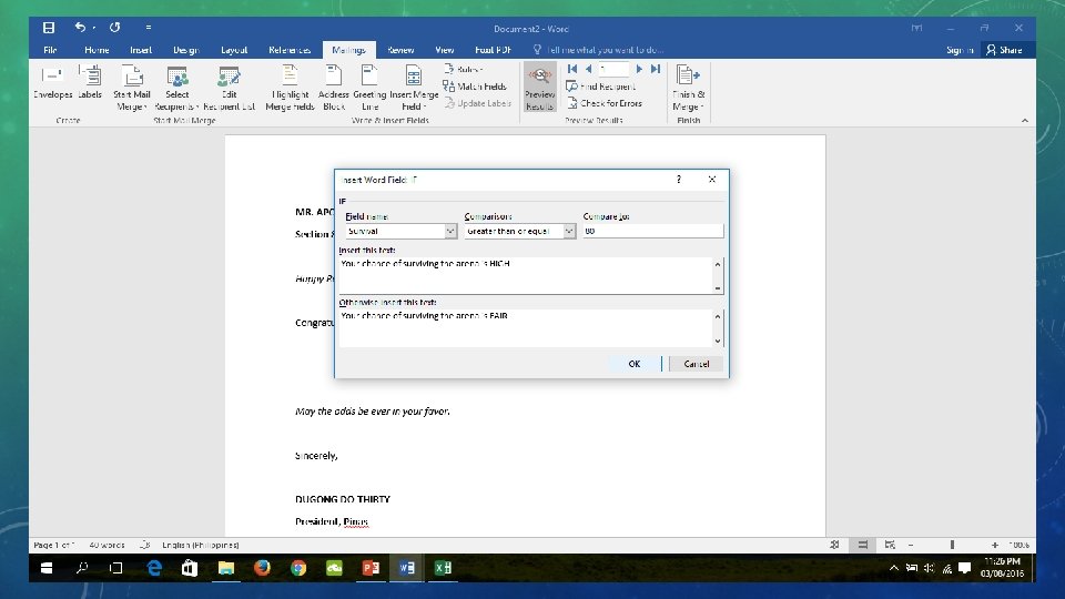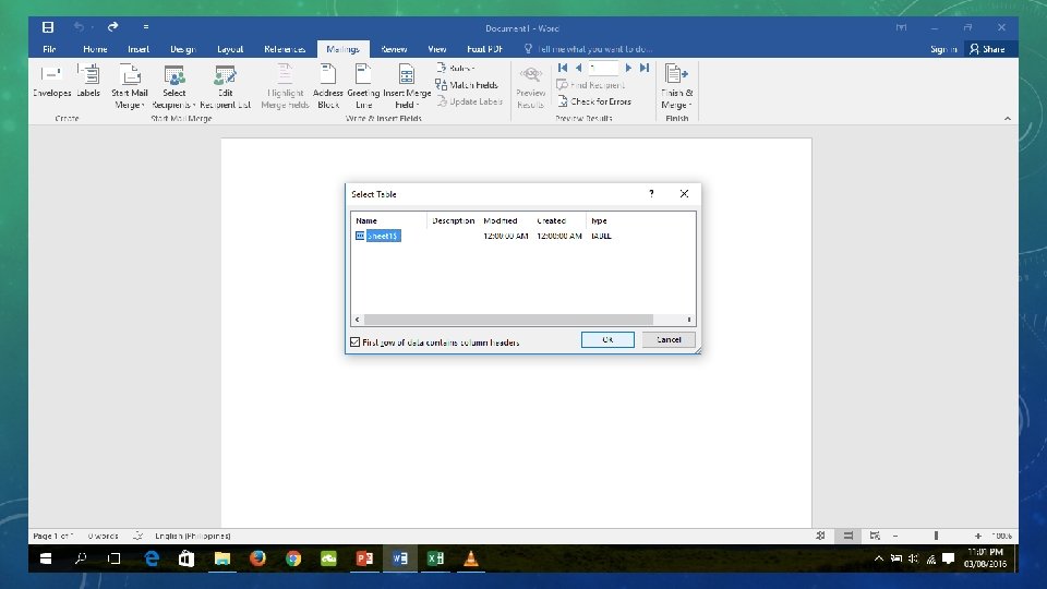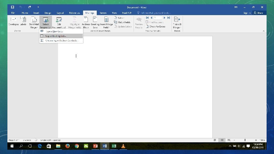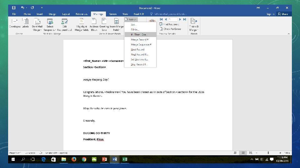 MAIL MERGE UTILIZATION 1. Create a spreadsheet containing your information. 2. Indicate the source of information in your word processor. 3. Select the spreadsheet file. 4. Select which sheet in the file contains the information. 5. Start writing or creating the template that you are going to use. 6. Check the result of label placement. 7. Implement rules. 8. Set up the rule. 9. Print the finished product. 10. Create a new document.