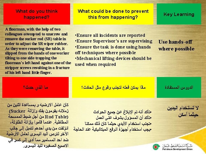 ﻛﺴﺮ ﺑﺎﻹﺻﺒﻊ 2017 ﻳﻨﺎﻳﺮ 03 Finger injury 03. 01. 2017 Main contractor name – LTI# - Date of incident