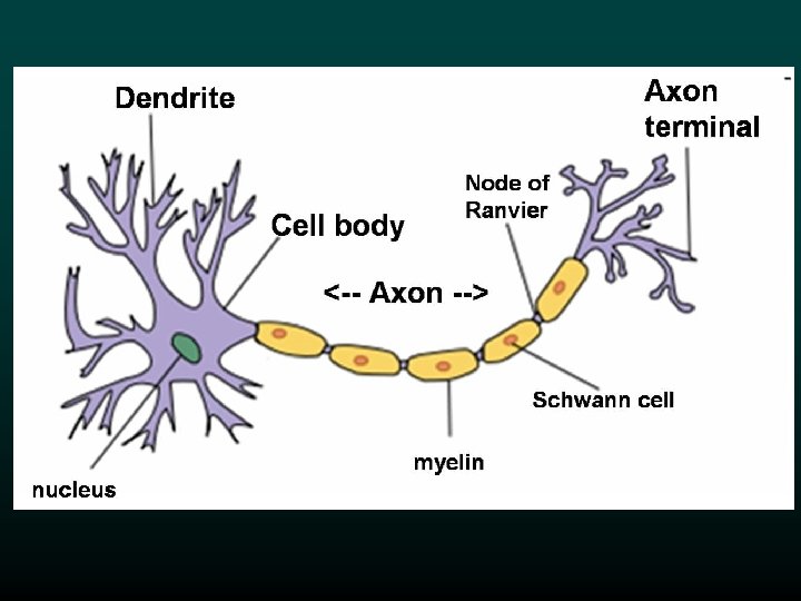 Parts of a Neuron 1. Cell body: contains nucleus & most of the cytoplasm 2. Dendrites: projections that bring impulses into the neuron to the cell body. 3. Axon: long projection that carries impulses away from cell body 1 2 3