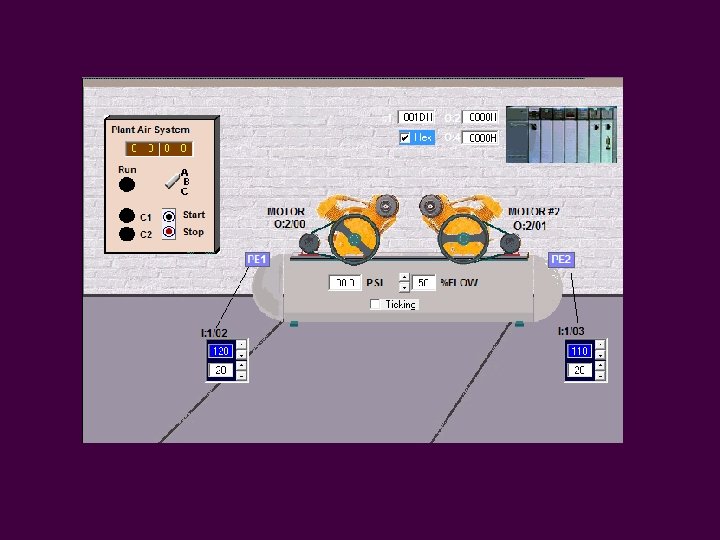 DVA KOMPRESORA Omogućite korisniku da pkrene i zaustavi sistem pomoc u odgovarajuc ih prekidača montiranih na upravljačkom panelu. Lampica "Run" treba da svijetli kada sistem radi. Lampica "C 1" bi trebalo da svijetli samo kada kompresor 1 radi. Lampica "C 2" bi trebalo da svijetli samo kada kompresor 2 radi. Kada kompresor dostigne postavljeni pritisak (kod PE 1 ili PE 2) on treba da se zaustavi i miruje dok pritisak ne opane ispod podešene vrijednosti %FLOW (zadaje se ručno na simualciji; ova granična vrijednost se odnosi na oba kompresora).