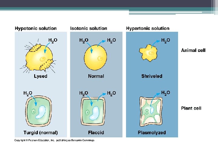 Effects of Osmosis on Cells Hypotonic: • Lower solute concentration outside of the cell Hypertonic: • Higher solute concentration outside of the cell Isotonic: • Concentration is the same inside and out ▫ Water moves into the cell ▫ Cell swells ▫ Water moves out of the cell ▫ Cell Shrinks ▫ Water moves in and out