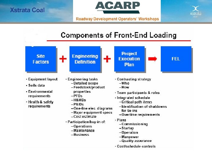 Acquiring NEW equipment and making a difference. How should I approach the exercise. An essential tool is Project Management - Front End Loading? Front-End Loading (FEL) is a term used to describe the activities undertaken during the project planning phases & prior to a project commitment being made. o Its about getting it right from the inception of the process before you get to a point where it is much harder and more costly to rectify issues. o. I t is all about doing the work upfront, understanding the issues, during the design phase because o There is never a better time to get it right than before you fully engage the O. E. M or start cutting the steel. Never are we in a better position to bargain? o How long do you think it should take to get things right.