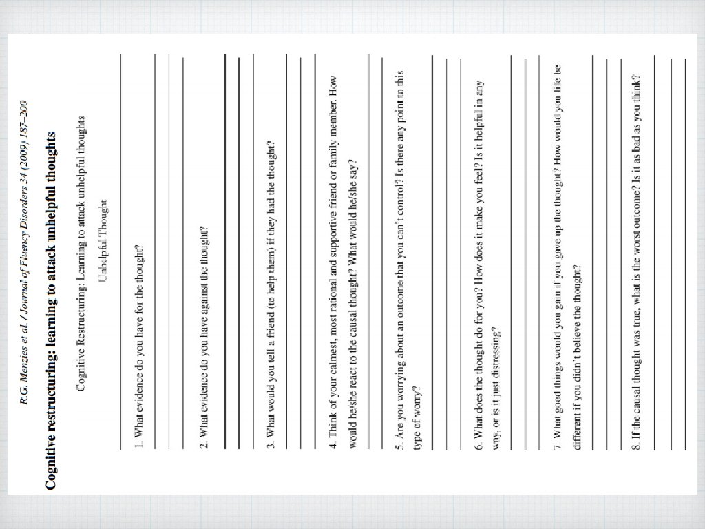 Psychological Factors Cognitive restructuring Remind me - what is the main assumption of CBT? Cognitive restructuring and behavioural techniques may be used to maintain good mental health. Cognitive restructuring aims to replace unhelpful thinking, or cognitive distortions, with more helpful thoughts. Complete the cognitive restructuring worksheet. This is an example of homework a CB therapist might give to a client.