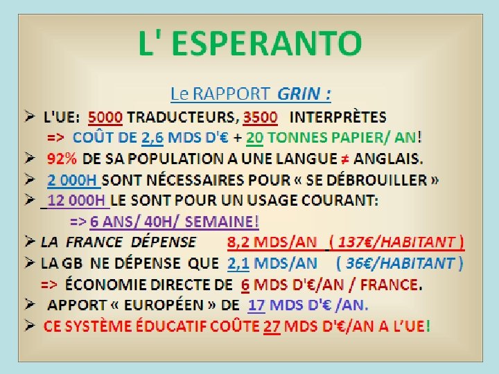 Quel est l’avantage d’une langue neutre Elle met les interlocuteurs au même niveau Supériorité Infériorité Supériorité Si la conversation est en anglais Si la conversation est en français Egalité Mais si la conversation est en esperanto