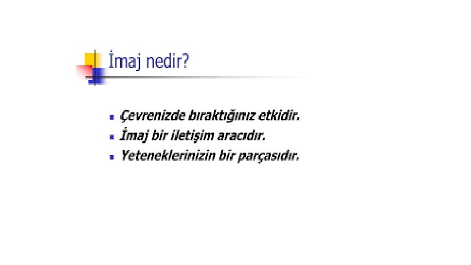 İMAJIN ÖZELLİKLERİ Buraya kadar yer verilen imaj tanımlarına dayalı olarak imajın özellikleri şöyle sıralanabilir: qİmaj algısının oluşabilmesi için dolaylı ya da dolaysız bir etkileşim gereklidir. q. Bilinçli ya da bilinçsiz, isteyerek ya da istemeyerek etkileşime geçilen öğeye yönelik bir imaj algısı oluşur. qİmaj algısı hemen oluşabileceği gibi zamanla da oluşabilir, bu algı zaman içinde de değişebilir. qİmaj bir düşünceyi, değer yargısını, izlenimi yansıtabileceği gibi bir algıyı, anlam setini de ifade edebilir. qİmaj algısının oluşması karmaşık ve çok yönlü bir süreçtir.
