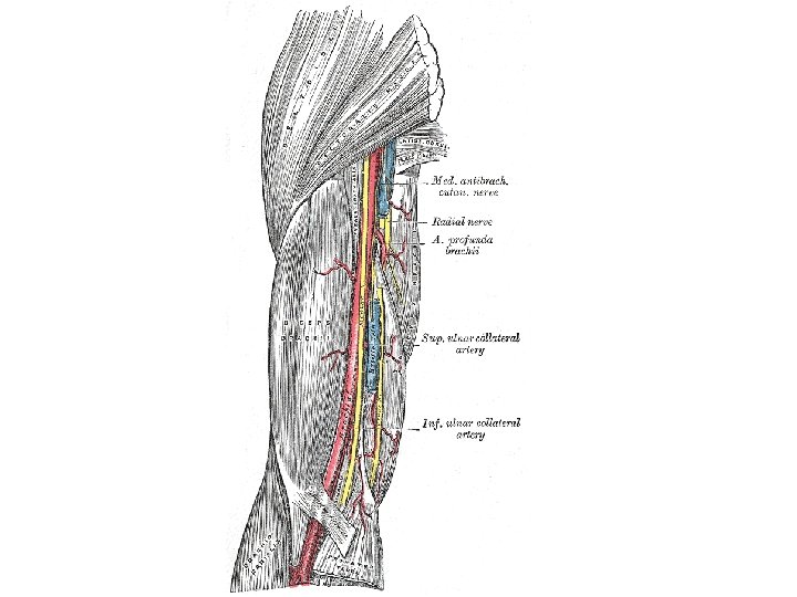 Anastomosis around elbow • Between branches of brachial artery and ulnar artery. • Between branches of profunda brachial artery and radial artery.