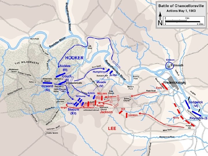 The Death of Stonewall Jackson ► After the first day of fighting, Jackson was shot by friendly fire while returning to camp. ► Jackson lost his left arm from his wound and it was buried near Chancellorsville; he died a 8 days later on, May 10, from his wounds ► With Stonewall Jackson’s death, Lee lost one of his best generals. ► Lee: “I have lost my right arm, and I am bleeding at the heart”