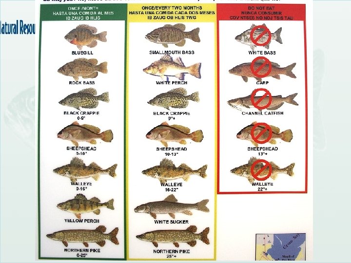 Ways to Avoid (reduce) Eating Contaminated Fish • Use following advisory – Determine the fish species that you’ve caught. – Measure your fish from the tip of the nose to the end of the tail. – Determine the eating advice for the fish from the following table.