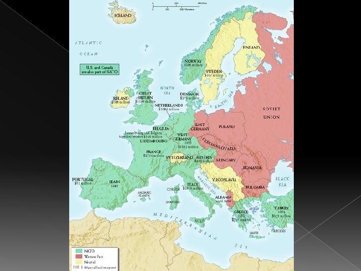 NATO vs. Warsaw Pact NATO (1949) = North Atlantic Treaty Organization › 10 western European nations, U. S. & Canada › Defensive military alliance Warsaw Pact (1955) › Soviet Union, East Germany, Czechoslovakia, Poland, Hungary, Romania, Bulgaria, and Albania › 1961 – Berlin Wall built, becomes the physical symbol of the Cold War Many countries do not join either side › India and China