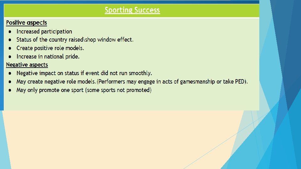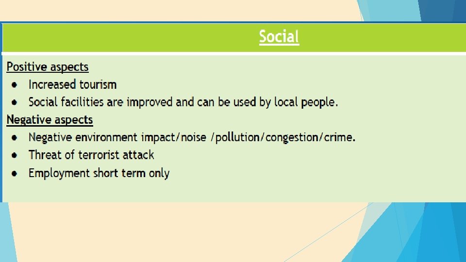 Advantages Disadvantages Investment in developing transport systems Bidding for the event can be expensive and you may not even win Increased tourism – More people visit your city/country and spend more money Events sometimes cost more money than you can make from it so the city/country actually loses money Commercial benefits – You receive a lot of money from sponsors Sometimes facilities are not used properly after the event and they become a waste of money Participation may increase in some sports If the event is not run properly then the status of the city/country decreases New facilities will be available to the public after the event has finished If the event is only focussed on one city then the other cities in the country may get upset that they haven’t benefited Morale of the city/country is raised Overcrowding and traffic during the event The status of the city/country is raised There is an increased risk of crime, protests and terror attacks The jobs that are created may only be short term. This means people will be unemployed again after the event Environmental effect – litter, pollution, etc