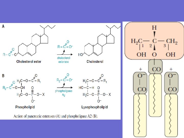 2. Action of Pancreatic secretion A- Bicarbonate (hormone secretin released from the intestine when acid enters the duodenum) raises the p. H of the contents of the intestinal lumen into a range (p. H ~ 6. 5). B-Lipase digests dietary triacylglycerols producing 2 free fatty acids and 2 -monoacylglycerol C-Colipase it binds to the dietary fat and to the lipase, thereby increasing lipase activity. D- Esterases remove fatty acids from compounds such as cholesterol esters (The ester bond is formed between the carboxylate group of a fatty acid and the hydroxyl group of cholesterol. ) E- phospholipase A 2 digests phospholipids to a free fatty acid and a lysophospholipid