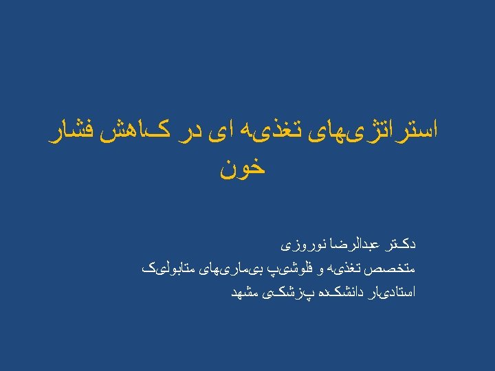 ﻋﻮﺍﻣﻞ ﻣﻮﺛﺮ ﺗﻐﺬیﻪ ﺍی ﺩﺭکﺎﻫﺶ ﻓﺸﺎﺭ ﺧﻮﻥ • • • Weight loss Reduced sodium intake Increased potassium intake Moderation of alcohol intake DASH style dietary pattern Supplementations