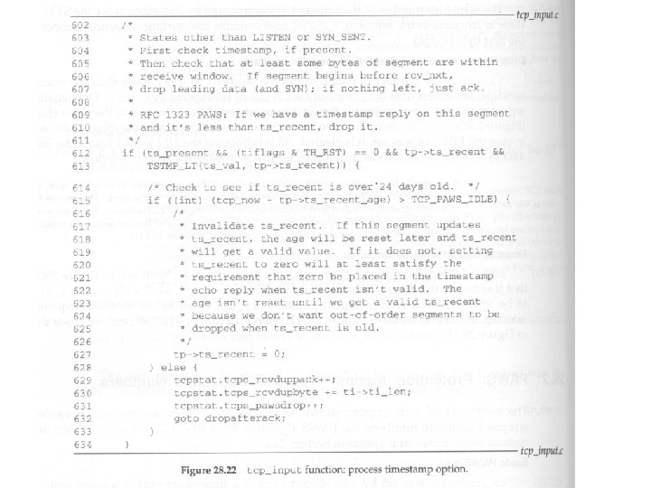 PAWS Used to Detect Problem 2 • PAWS (Protect against wrapped sequence numbers: RFC 1323) is a scheme used in tcp_input() to detect problem 2. • PAWS is based on the premise that the 32 -bit timestamp values wrap around at a much lower frequency than the 32 -bit sequence number, on a high-speed network. – The TCP timestamp option is assumed to be used in the TCP header. – Right now in Freee. BSD 4. x, one tick used in timestamp represents 1 ms. Therefore, it needs about 24 days (1193 hours) to change the sign bit.