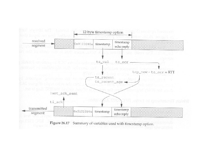 Timer Management • Timers are extensively used to measure RTTs. – When a packet is sent, a timer is started. When the corresponding ACK returns, the timer is stopped. The elapsed time of the timer represents one RTT sample. • The above approach can be used on a low speed network such as 10 Mbps. On a gigabit network, where a 1500 -byte packet is sent every 12 microseconds, this approach is infeasible. • To reduce the high frequency of timer setup/cancel operations, the original solution is to get a RTT sample every RTT, rather than getting a RTT sample for every sent packet. – Simple to implement. Just do not set up another timer until the previous timer is cancelled. – However, the accuracy suffers.