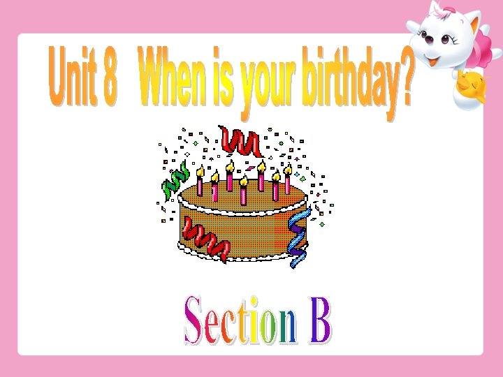 Target language My mother’s birthday is December 10 th. • I will have an English test on 23 rd. So I will study hard for it. • I will go to Amy’s home on December 27 th, because it is her birthday party. • — When is the English test? — It’s December 23 rd.