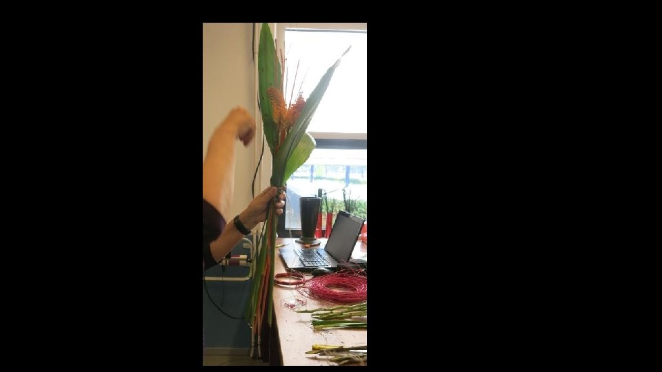 Je kunt lang sterk blad (hier Aspidistra) al hoger gebruiken. Eerst zetten we de stelen vast met touw en daarna buigen we de bladeren om en zetten die ook weer vast (zo krijgen we een bolling in het blad).