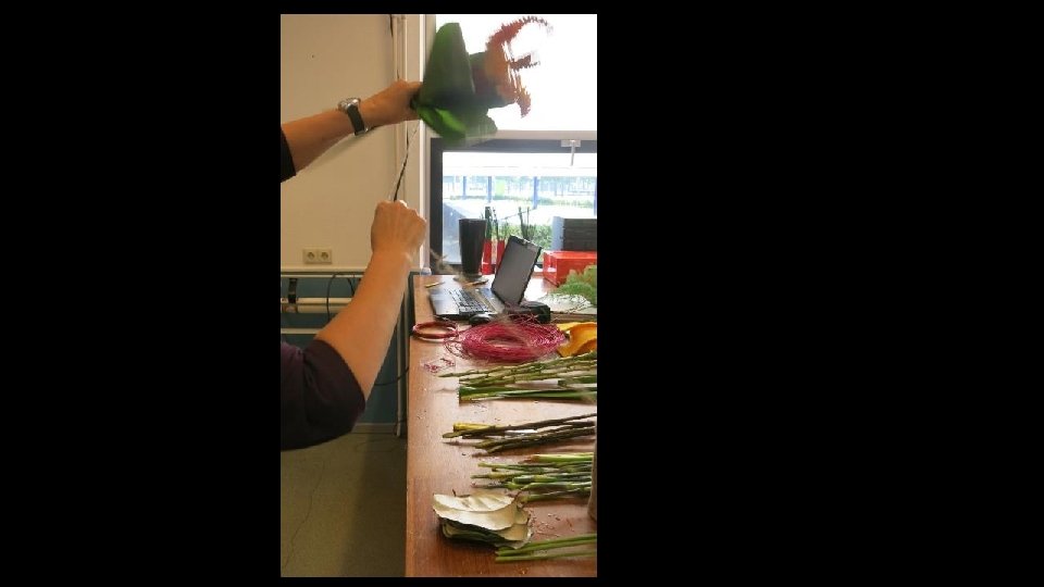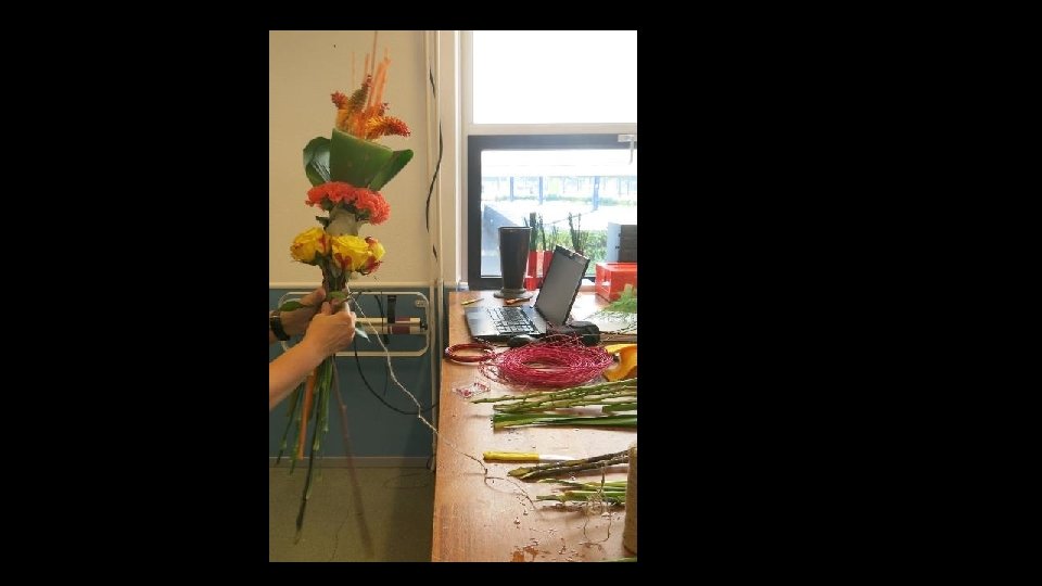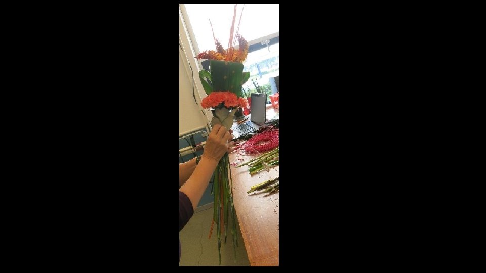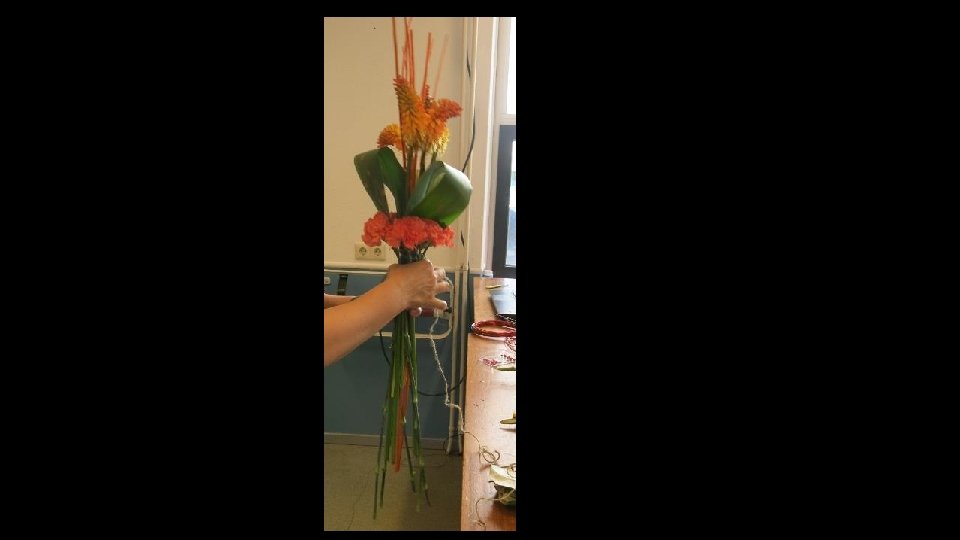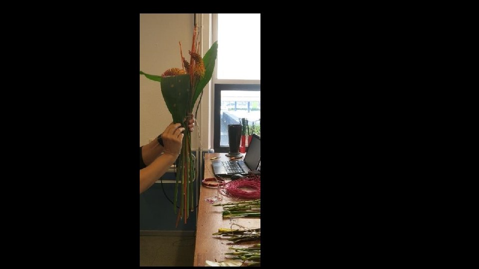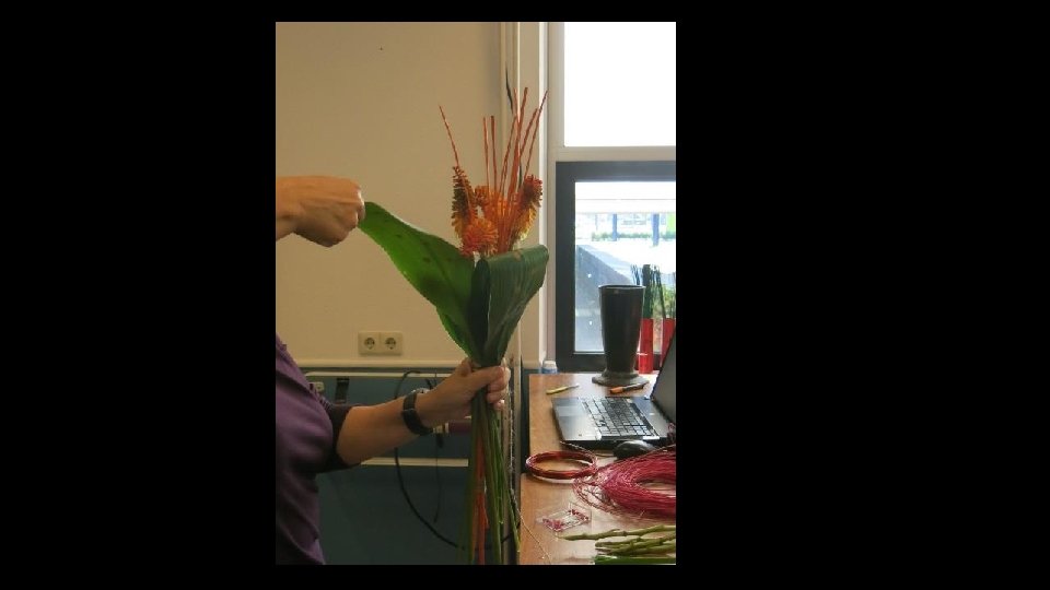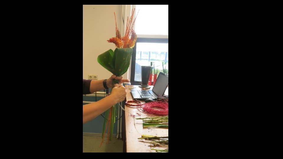 Je kunt ook blad gebruiken om langs de stelen te verwerken (misschien om touw weg te werken ofzo…), maar het moet wel blad zijn wat mooi kan indrogen want dit blad krijgt geen water!