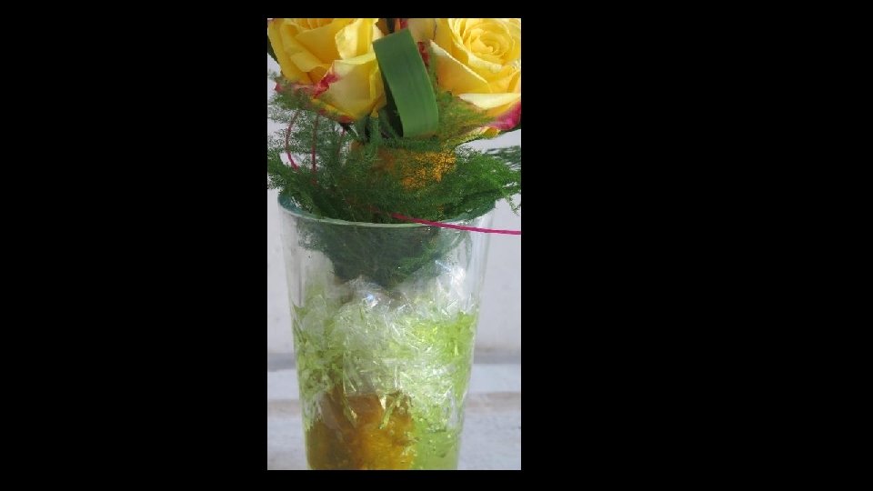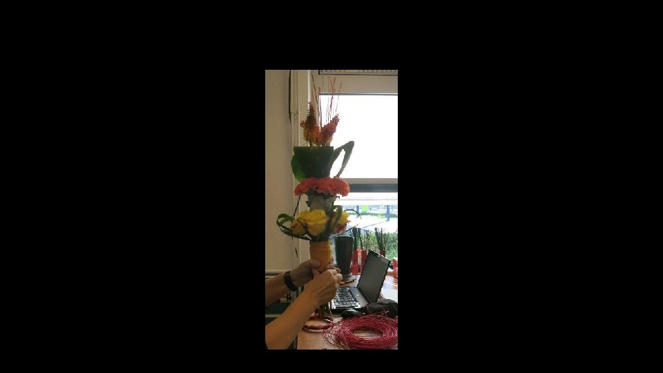 Het boeket in een vaas, vastgezet d. m. v. folie (anders staat het boeket scheef)