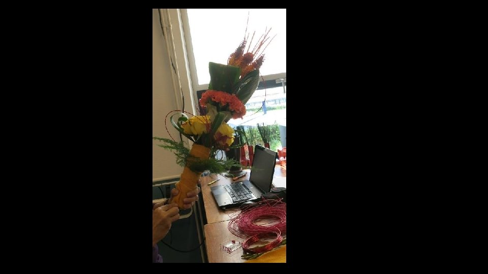 Hier is het vilt op de juiste maat afgeknipt en wordt vast gemaakt aan het boeket (nu d. m. v. touw)!