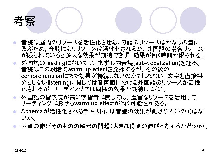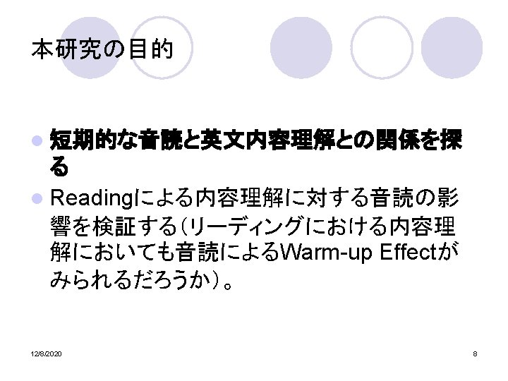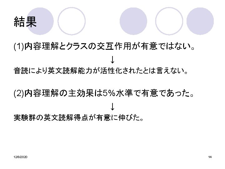 結果2 内容理解の主効果 5%水準で有意 : F(1, 74) = 8. 7 p<. 05 12/8/2020 Fig. 3 Listeningと音読後のReading Comprehension Test結果 13